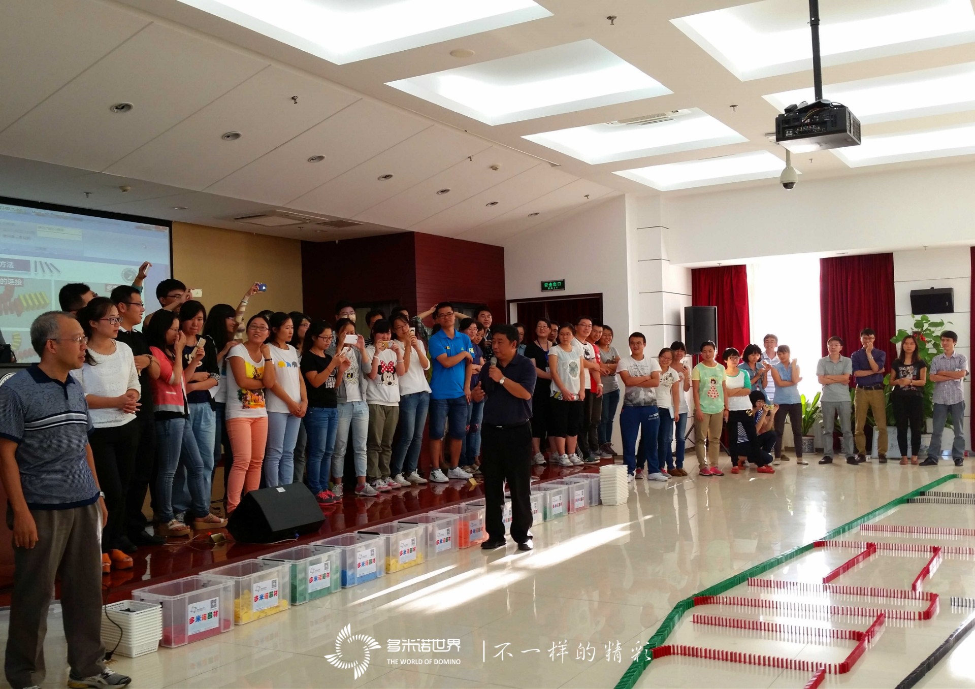 來自研究所12個創新團隊和管理支撐人員共70余人參加了此次培訓。一下午的時光短暫而快樂,在多米諾世界指導老師的的引導下,大家齊心協力完成了3萬多塊的骨牌碼放,一幅由過程大廈、所徽、化學符號組成的完美畫卷展現在學員面前,在陳運法書記的鼓勵和助威下,由參與者中四位最小的學員共同啟動多米諾倒牌這一榮耀時刻,完成了觸一發而動全局的瞬間精彩。