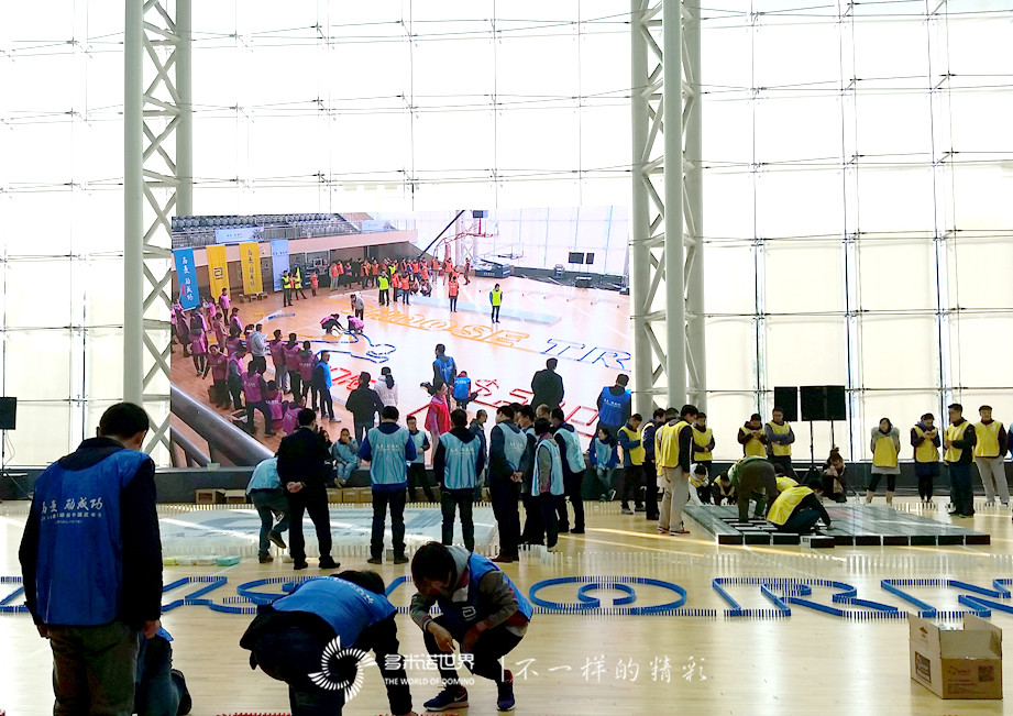 當所有骨牌都擺放好后,大家緊張的心情得到了暫時的舒緩,輕手輕腳地走到體育館二層看臺,觀看凝聚所有伙伴的力量完成的精美多米諾畫卷。