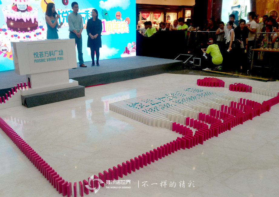 去年的更名儀式現場,放飛了近千只蝴蝶,寓意“破繭成蝶、美麗新生”;今年的周年慶典更加別出心裁,特別邀請多米諾世界團隊,策劃設計了新穎時尚的多米諾啟動儀式,用顧客寫滿祝福的骨牌組成愛心圖案,碼放在悅薈萬科LOGO畫面旁邊,令整幅多米諾圖案幸福感滿溢。