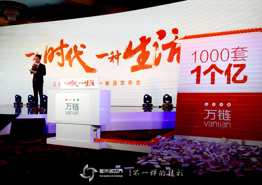 2016年7月20日,作為國內較大房地產開發商萬科和著名地產服務商鏈家共同組建的家裝公司,萬鏈“一個時代·一種生活2016萬鏈V+新品發布會”在北京成功舉辦。主辦方特別邀請多米諾世界團隊,用新穎時尚的多米諾啟動儀式推出V+產品,當五位嘉賓共同啟動插卡機關,骨牌瀑布般滑落,顯現出V+產品已成交千套,金額過億的信息時,引發現場轟動。