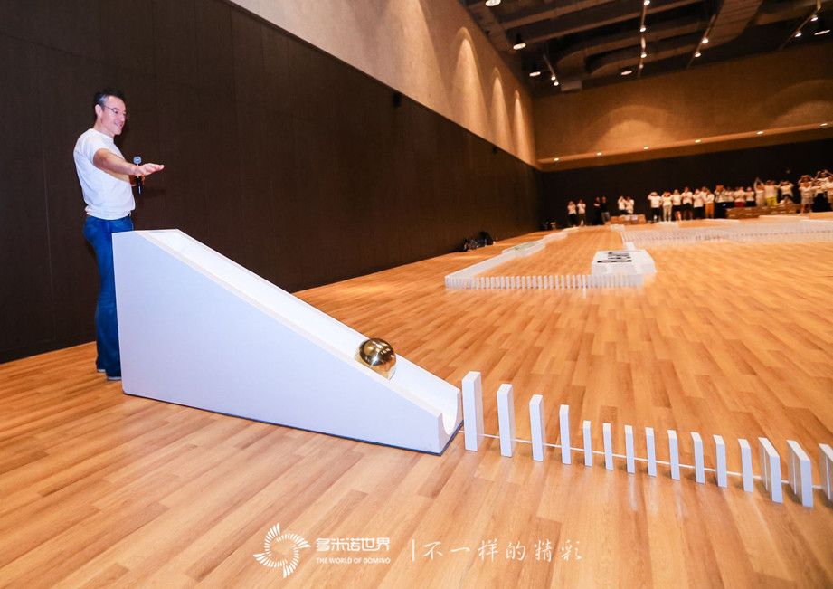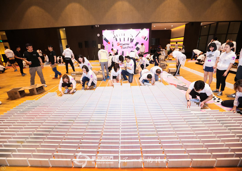 啟動的金球順勢而下,撞擊到第一枚多米諾骨牌,一幅幅多米諾畫面成功呈現,隨著骨牌的前行,隊員們都紛紛高舉手機,記錄這精彩難忘的一刻,當場地中央的巨幅畫面成功展現,“Growing Together”映入大家眼簾,至此,一幅精美的絲芙蘭多米諾畫卷完全顯露出來。