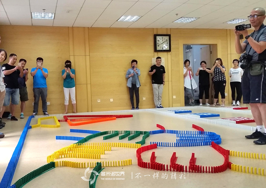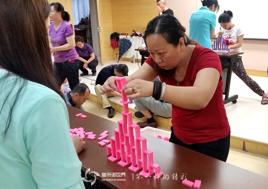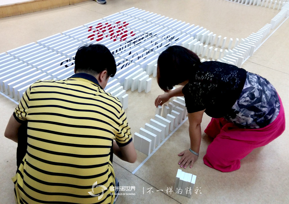 為了讓大家更快的進入角色,多米諾世界團隊的王磊老師介紹完多米諾運動后,特別設置了一個多米諾游戲挑戰賽。三個精巧、有趣的多米諾游戲,激起了大家的興趣,令所有隊員很快便沉浸在多米諾的世界中。在一枚枚骨牌的堆砌過程中,一張張專注的臉龐,失敗時的沮喪目光,成功時的神采飛揚,仿佛回到了難忘的童年時光。